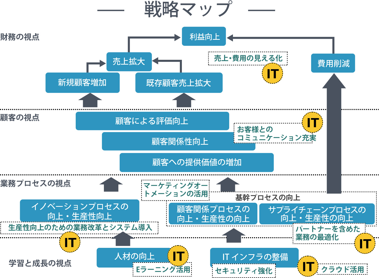 このように導入目的や目標を見つける際、重視すべきことは「経営的な視点」です。企業の将来に何が大切か整理するために、以下の「戦略マップ」を使って考えます。
