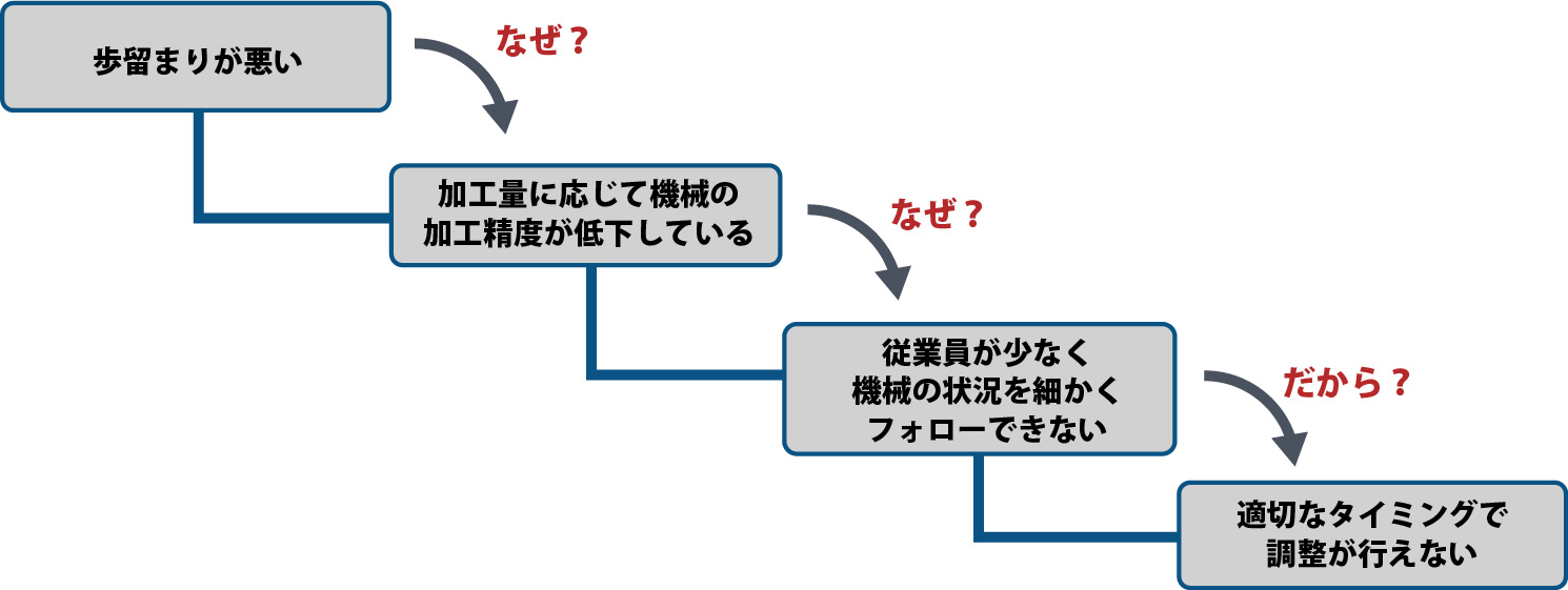 真因を特定する方法としては、古典的ですが「なぜ?」を5回繰り返す「なぜなぜ分析」が一般的です。