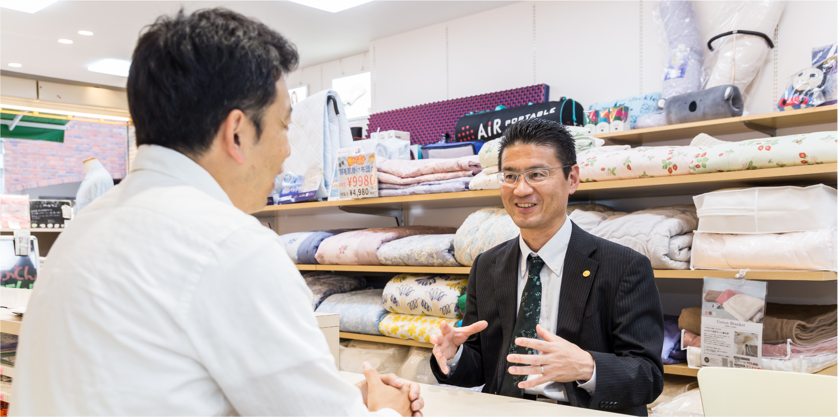 ご紹介いただいた当初、「個人店様なら、ECサイトの活用方法を改善すれば解決するのでは?」と仮説を立てていましたが、実際に鳥居社長にお会いすると、早い段階からECサイトを活用しPayPayなどキャッシュレスの知識も豊富。顧客管理以外にもITを活用したアイデアをたくさんお持ちで、「将来的には従業員の年収を1000万円にする」と非常に高いビジョンを掲げておられます。「これは"町の布団屋さん"という捉え方ではいけない」と考えを変え、鳥居社長のアイデアをいかに実現するか、理想と現実を繋ぐ架け橋になろうと思いました。